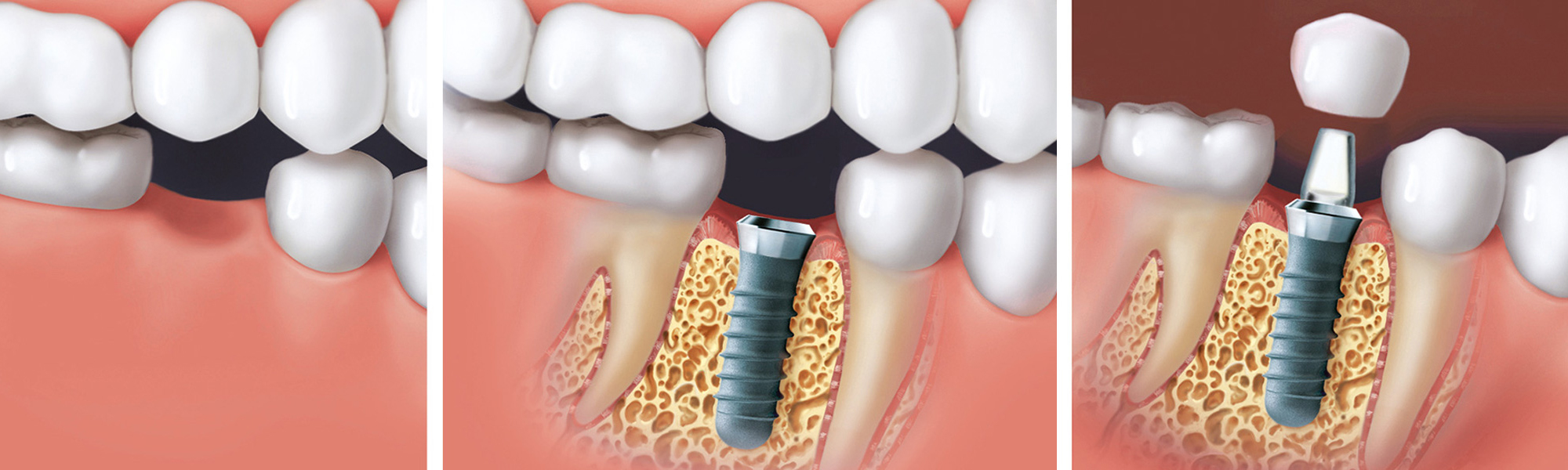 Nach ausführlicher Diagnostik und Planung wird das Implantat ambulant unter örtlicher Betäubung, Sedierung oder auf Wunsch auch unter Vollnarkose in den Kieferknochen gesetzt. Während einer individuell festzulegenden der Einheilzeit – in der Regel 4 bis 12 Wochen – verwächst der Knochen fest mit dem Implantat. In dieser Zeit erhalten Patienten einen provisorischen Zahnersatz. Nach der Einheilung funktioniert das Implantat wie eine künstliche Zahnwurzel und bietet eine sichere Basis zur Befestigung Ihrer neuen Zähne – Kronen, Brücken oder Prothesen. Wie natürliche leiten implantatgetragene Zähne die beim Kauen entstehenden Kräfte gleichmäßig in den Kieferknochen. Der Knochen wird gesund belastet.